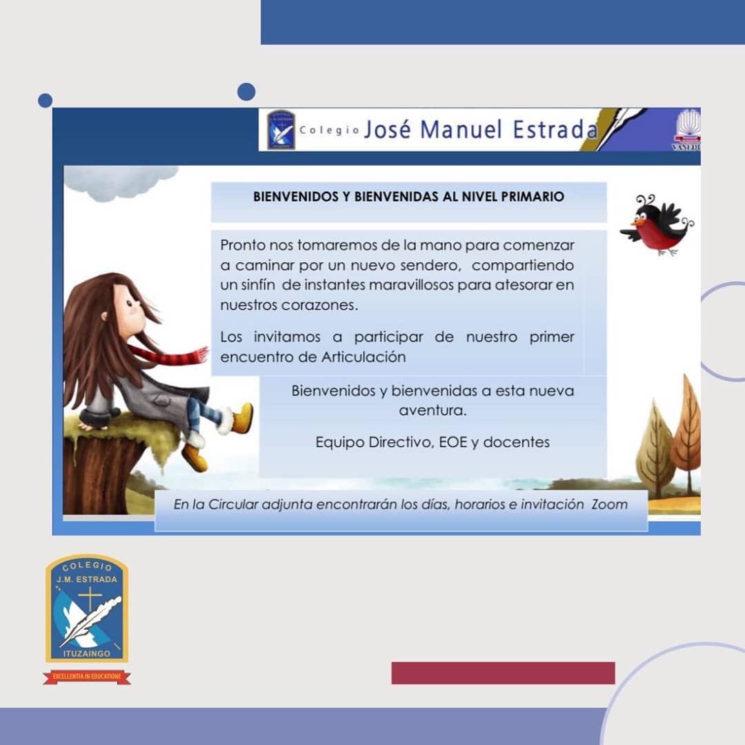 Estimadas Familias. El colegio José M Estrada siempre ha priorizado la articulación desde hace tiempo. Hoy es necesario reconstruir y valorar la riqueza de estas prácticas a la luz de los enfoques propuestos en los Diseños Curriculares y en un contexto distinto, la virtualidad. Por ese motivo queremos desde el Nivel Primario, comenzar a acompañarlos en este nuevo camino que empieza a construirse este año.